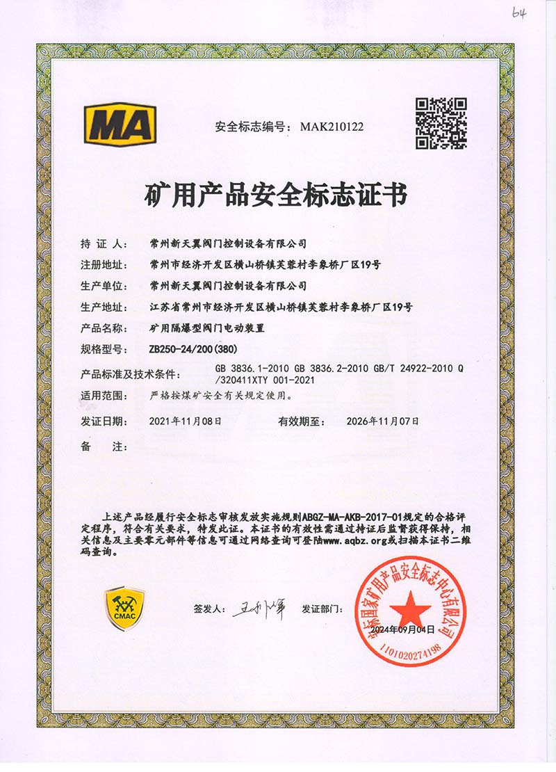 礦用產品安全標志證書ZJK180-24(380)